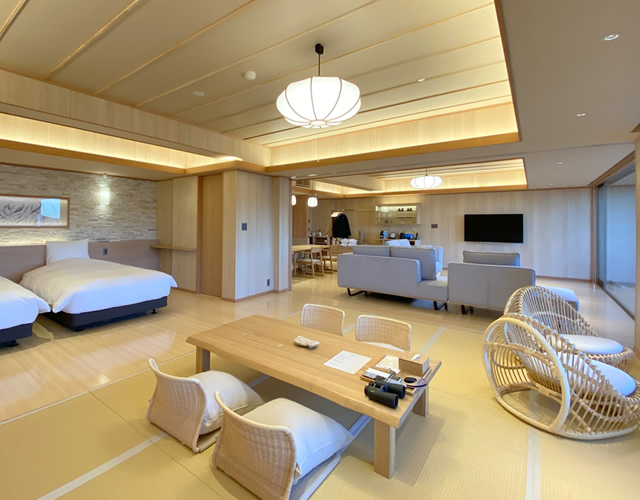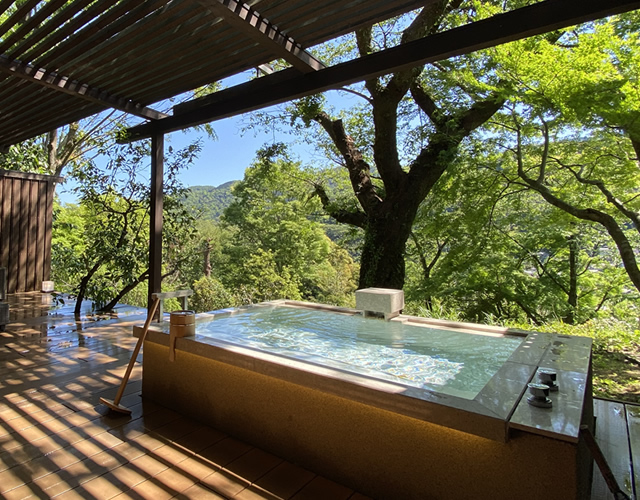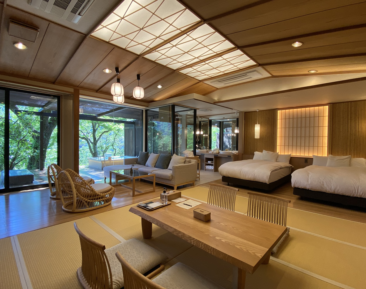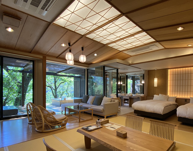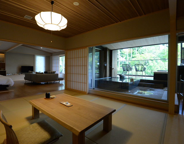 数寄屋建築をベースとした、凛とした佇まいと温かみ、スタイリッシュなデザインを融合したしつらい。湯河原の静寂な自然と光を存分に取り込んだ意匠で、落ち着きあるご滞在を演出いします。