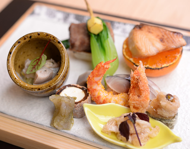 日本旅館の醍醐味である食事。私たちは、旬の食材や地元の素材にこだわり、四季を彩る創作懐石料理をお客さまに提供しています。伝統に新たな革新を掛け合わせ、常に食の極みをつくりだしていきます。